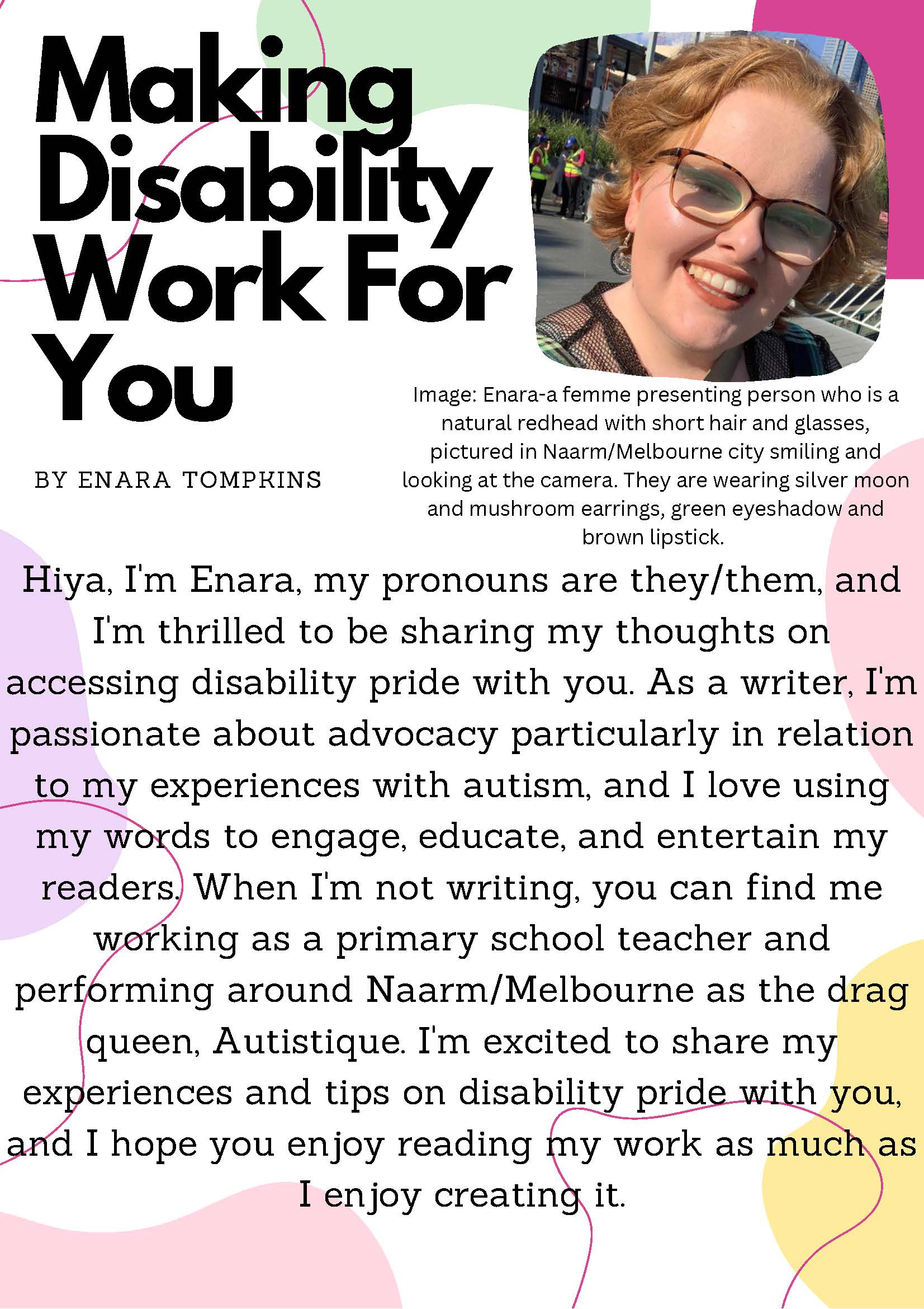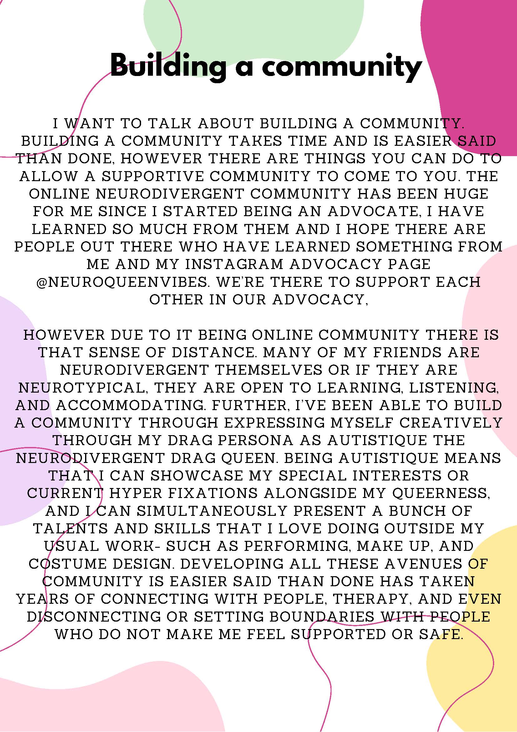 In their personal time they have been writing a neurodivergent advocacy blog for almost 2 years, which you can follow @neuroqueenvibes on Instagram. You can also find them running around Naarm/Melbourne as the neurodivergent drag queen, Autistique, chuck them a follow on Instagram @autistiquedrag.