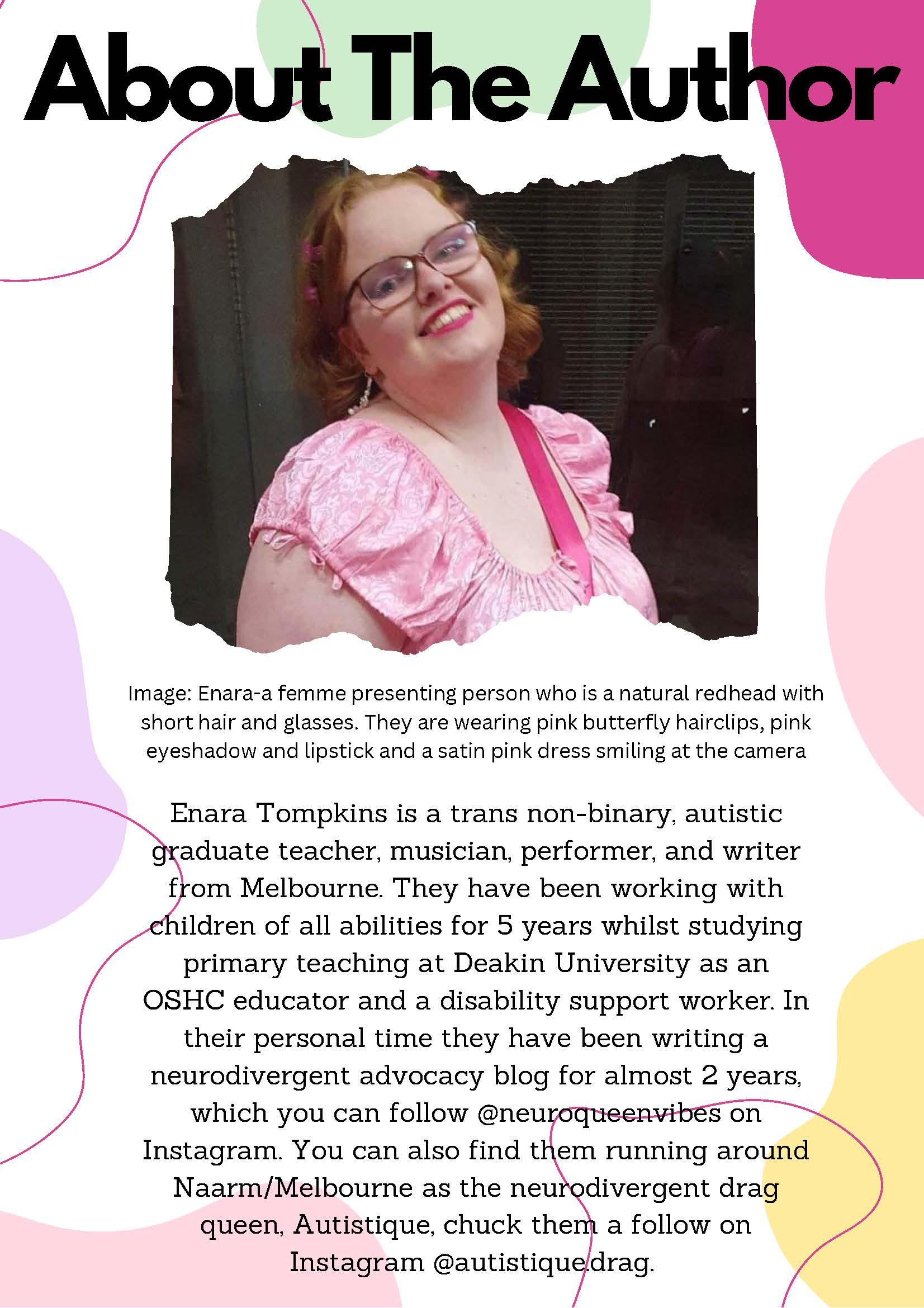 Enara Tompkins is a trans non-binary, autistic graduate teacher, musician, performer, and writer from Melbourne. They have been working with children of all abilities for 5 years whilst studying primary teaching at Deakin University as an OSHC educator and a disability support worker.